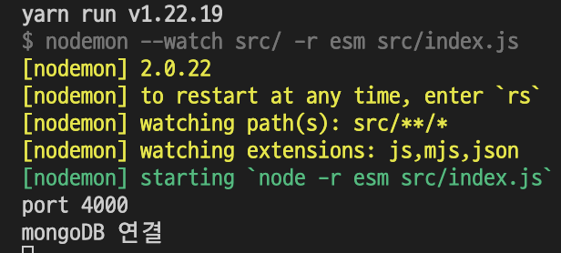 mongoose 데이터베이스 연결하려고 nodemon 통해서 명령어 실행하니까 오류가 발생했다.