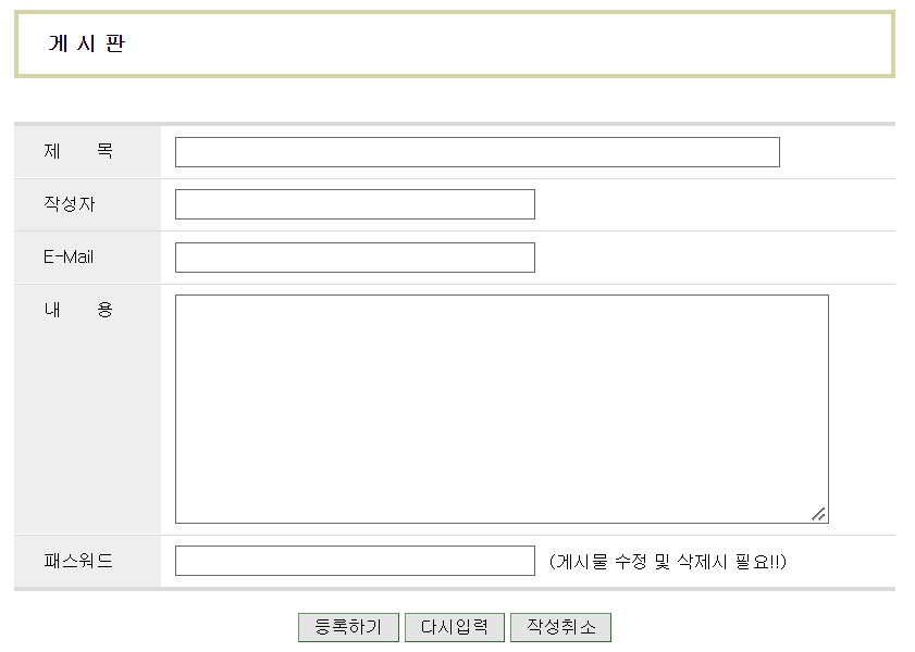 중간에 작성자부터 패스워드까지 입력하는 코딩은 같으며 (내용은 input대신 textarea로 설정)